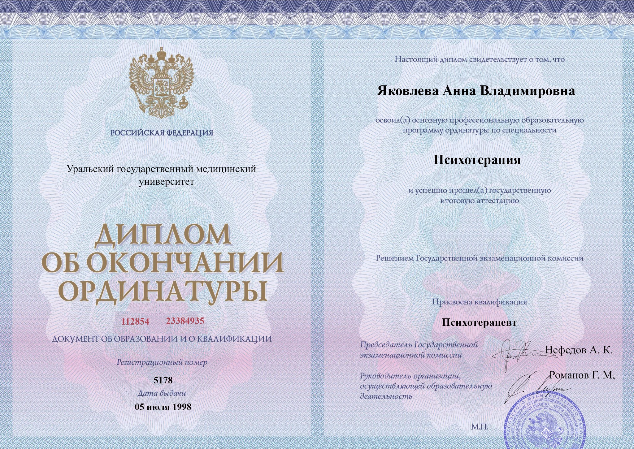 • Московский государственный университет имени Ломоносова МГУ (психотерапия).
